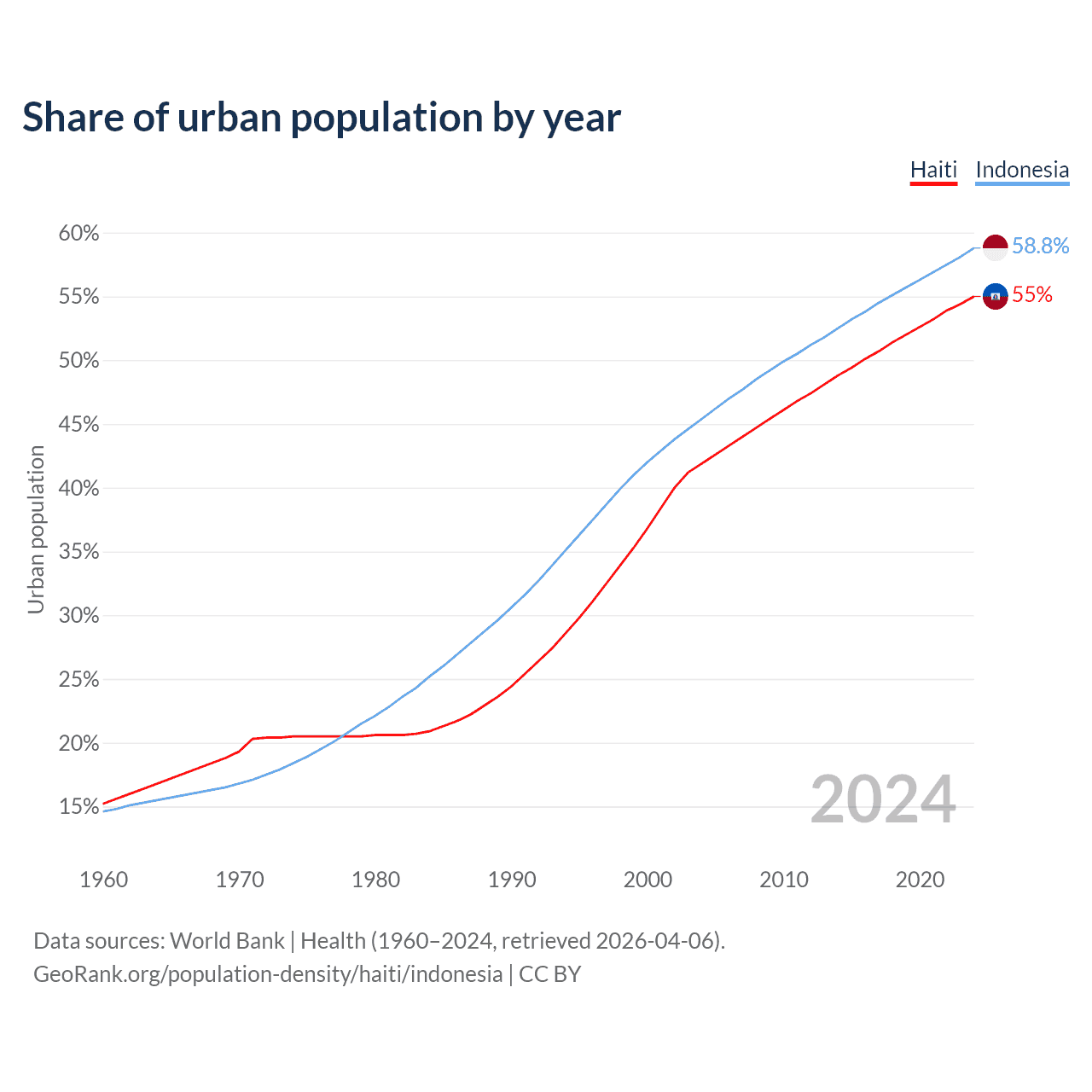 From 2004 to 2024, the share of urban population changed from 41.9% to 55% in Haiti and from 45.4% to 58.8% in Indonesia.
