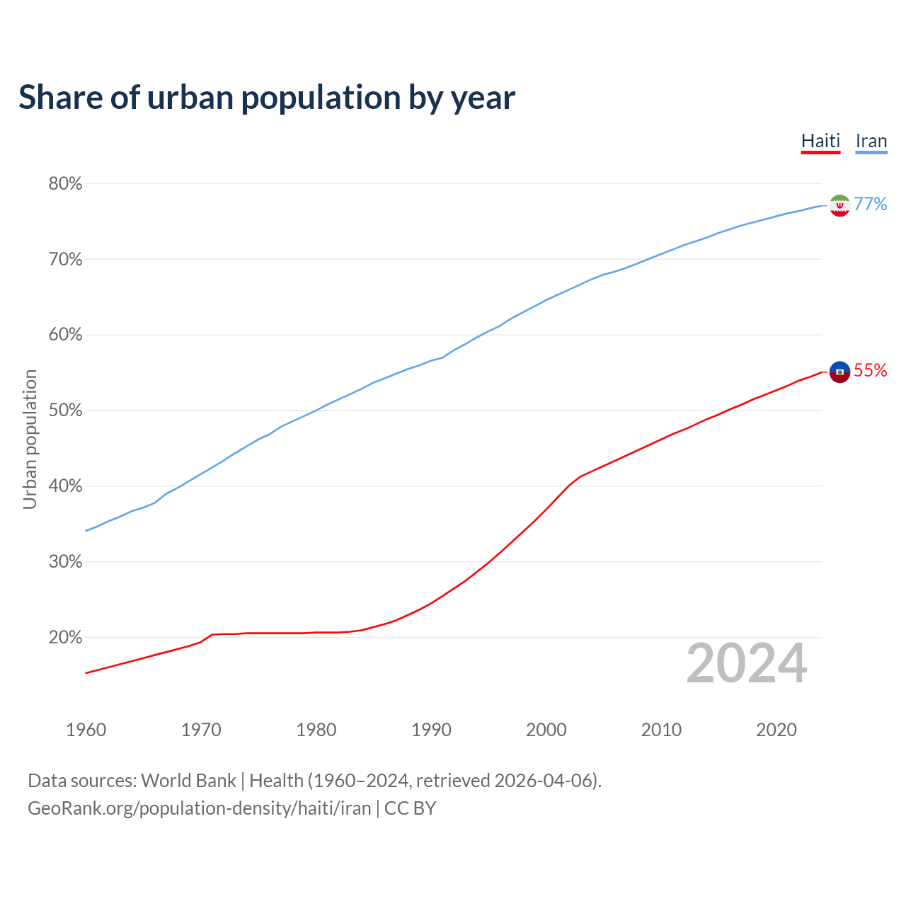 From 2004 to 2024, the share of urban population changed from 41.9% to 55% in Haiti and from 67.3% to 77% in Iran.