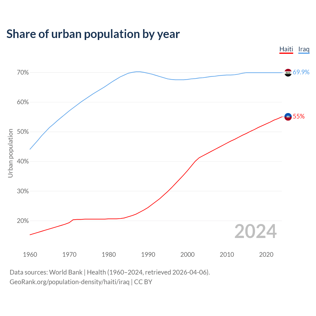 From 2004 to 2024, the share of urban population changed from 41.9% to 55% in Haiti and from 68.2% to 69.9% in Iraq.