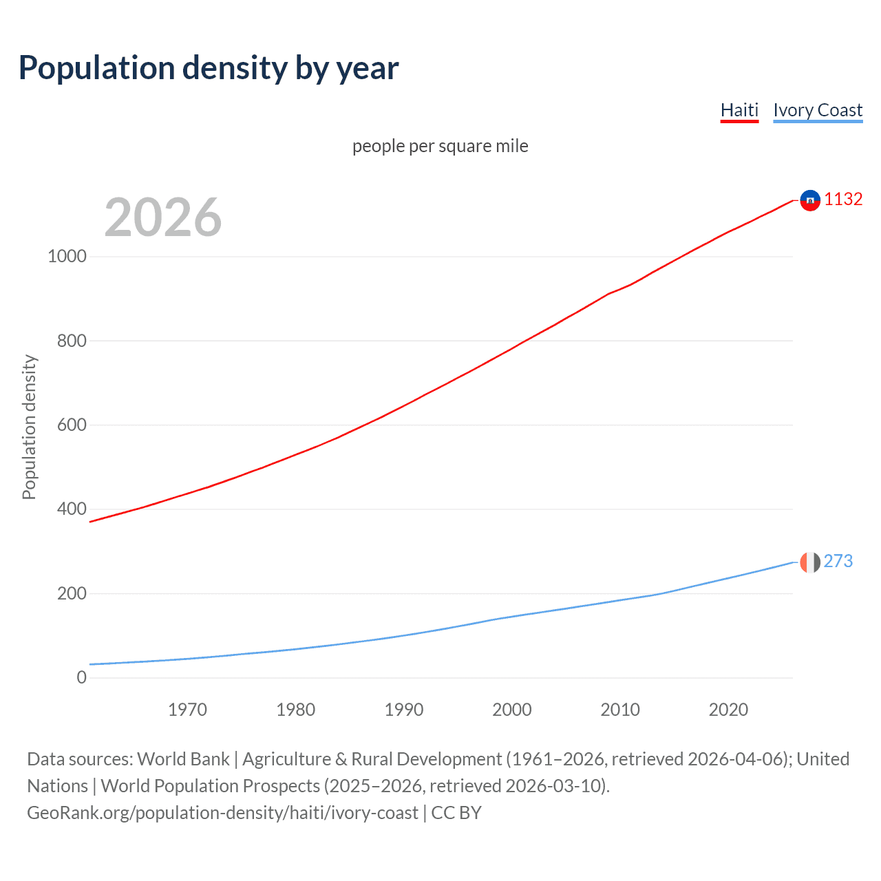 From 2006 to 2026, population density in Haiti increased by 30.6%, compared to a 63.1% growth in Ivory Coast.
