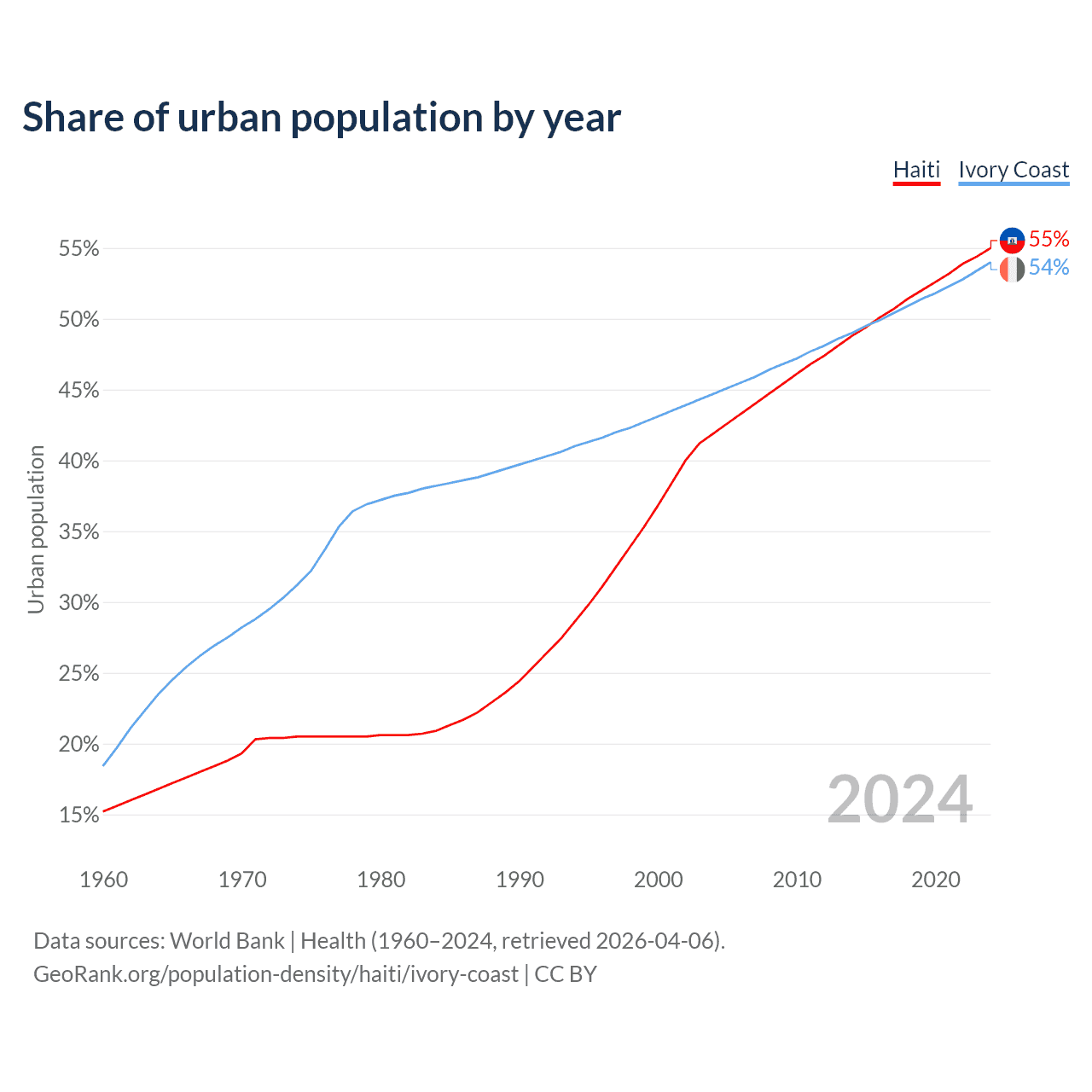 From 2004 to 2024, the share of urban population changed from 41.9% to 55% in Haiti and from 44.7% to 54% in Ivory Coast.