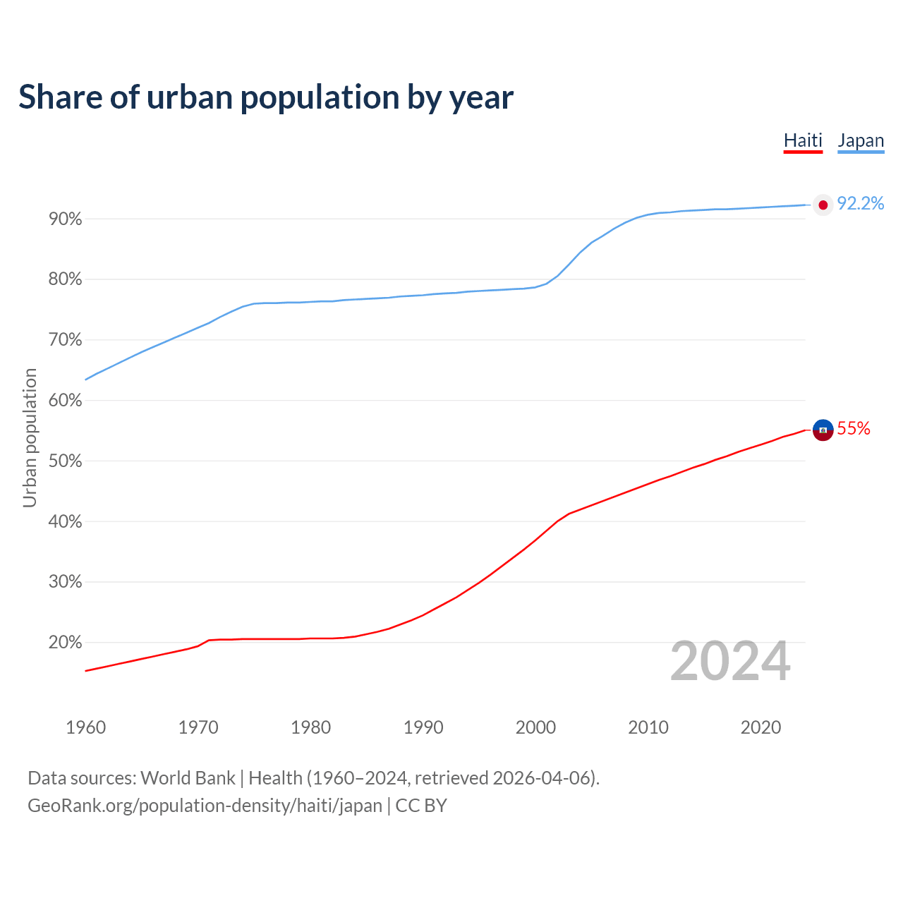 From 2004 to 2024, the share of urban population changed from 41.9% to 55% in Haiti and from 84.4% to 92.2% in Japan.