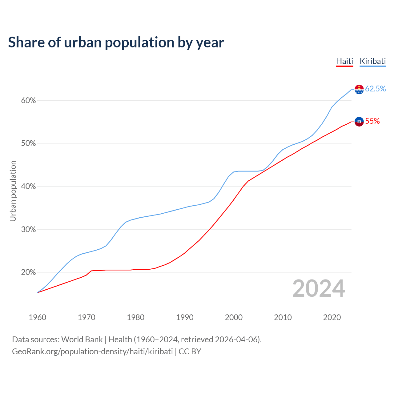From 2004 to 2024, the share of urban population changed from 41.9% to 55% in Haiti and from 43.5% to 62.5% in Kiribati.