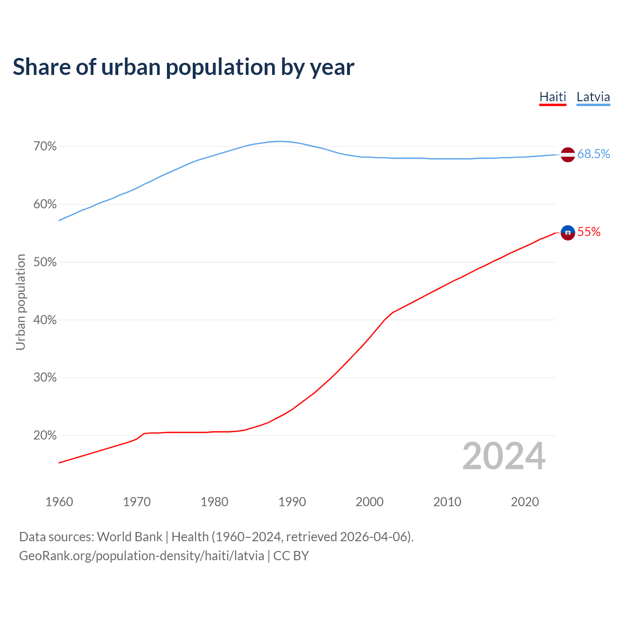 From 2004 to 2024, the share of urban population changed from 41.9% to 55% in Haiti and from 67.9% to 68.5% in Latvia.