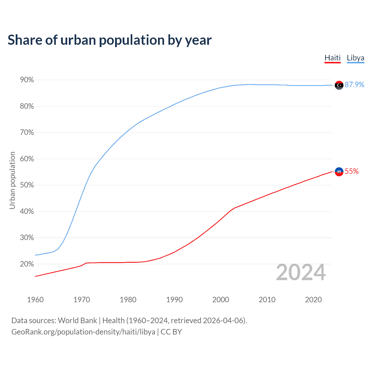 From 2004 to 2024, the share of urban population changed from 41.9% to 55% in Haiti and from 88% to 87.9% in Libya.