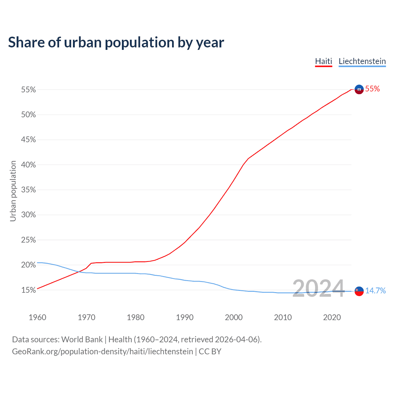 From 2004 to 2024, the share of urban population changed from 41.9% to 55% in Haiti and from 14.7% to 14.7% in Liechtenstein.