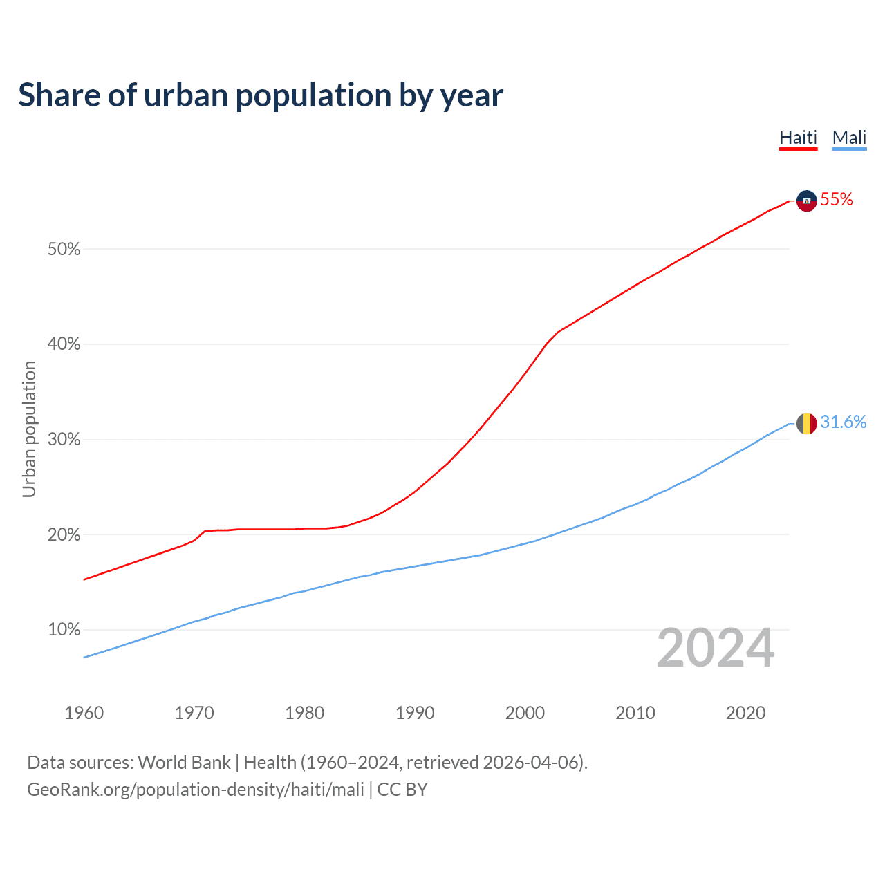 From 2004 to 2024, the share of urban population changed from 41.9% to 55% in Haiti and from 20.5% to 31.6% in Mali.
