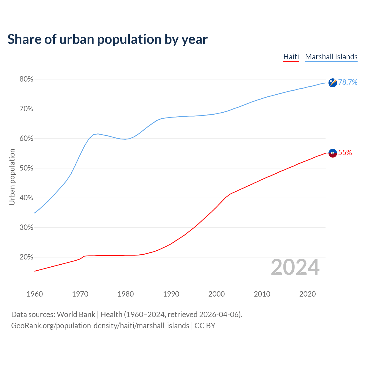 From 2004 to 2024, the share of urban population changed from 41.9% to 55% in Haiti and from 70.1% to 78.7% in the Marshall Islands.