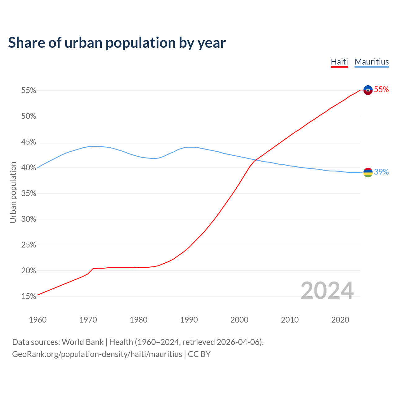 From 2004 to 2024, the share of urban population changed from 41.9% to 55% in Haiti and from 41.3% to 39% in Mauritius.