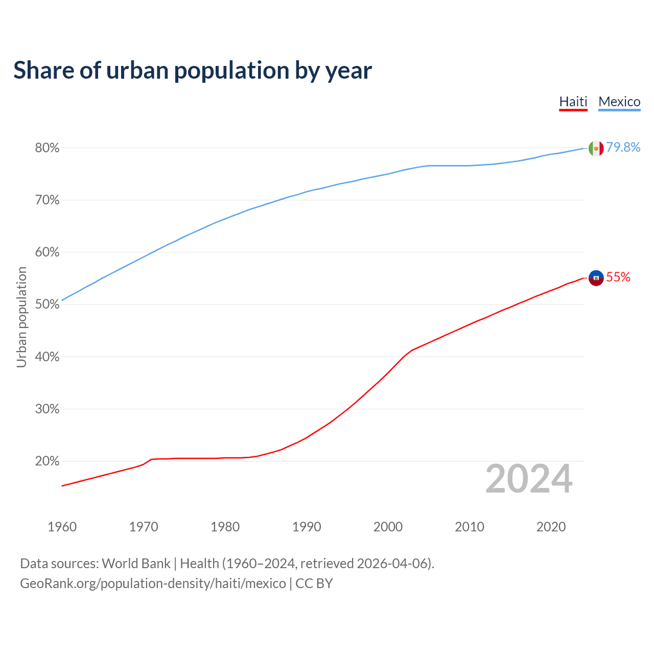 From 2004 to 2024, the share of urban population changed from 41.9% to 55% in Haiti and from 76.3% to 79.8% in Mexico.