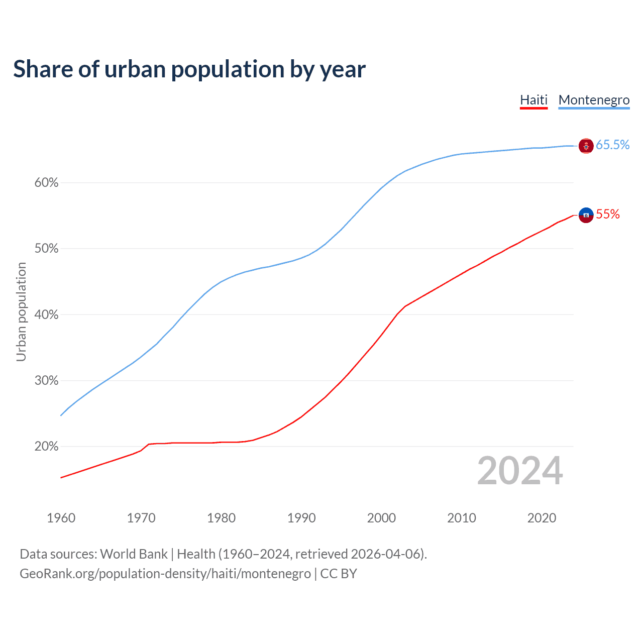 From 2004 to 2024, the share of urban population changed from 41.9% to 55% in Haiti and from 62.2% to 65.5% in Montenegro.