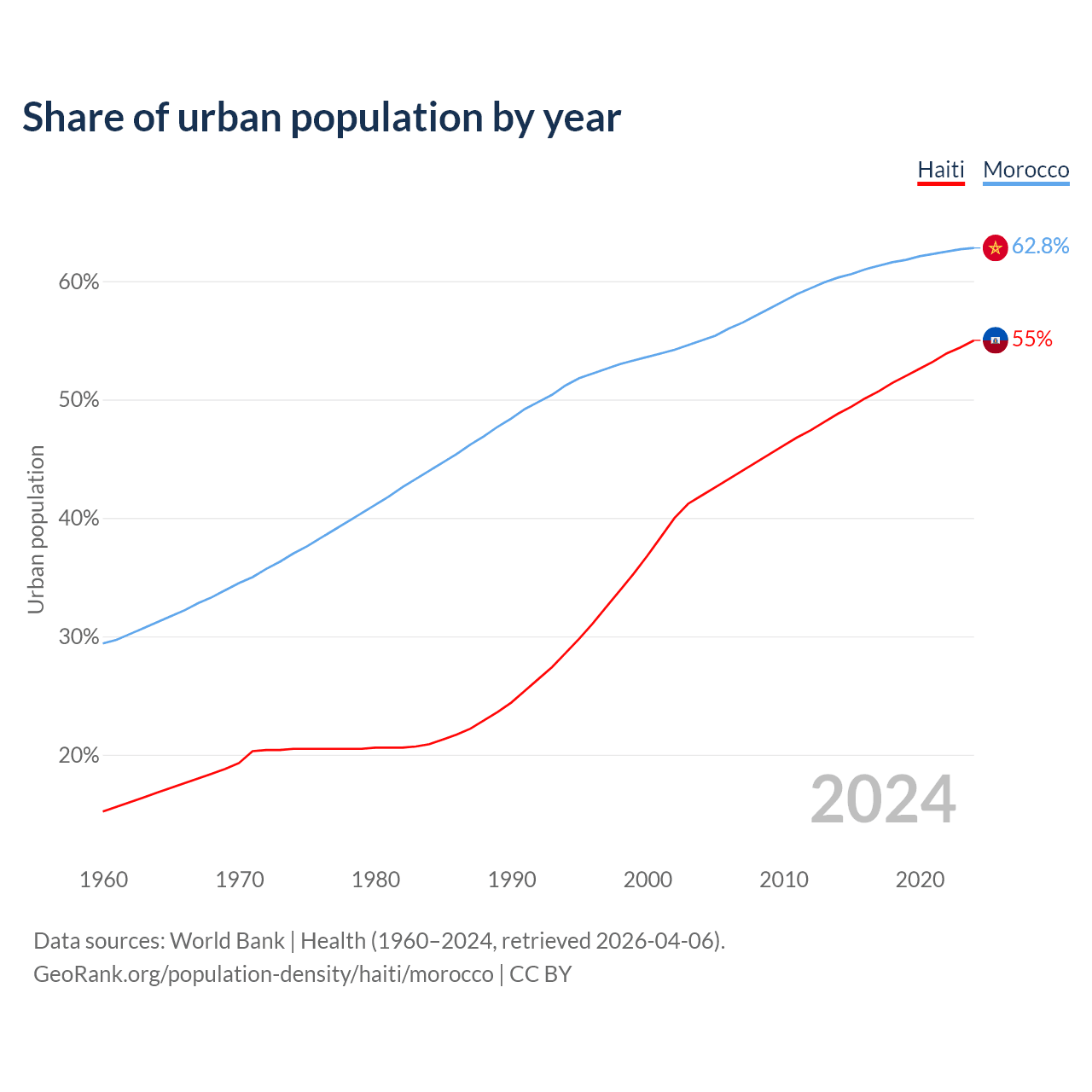 From 2004 to 2024, the share of urban population changed from 41.9% to 55% in Haiti and from 55% to 62.8% in Morocco.