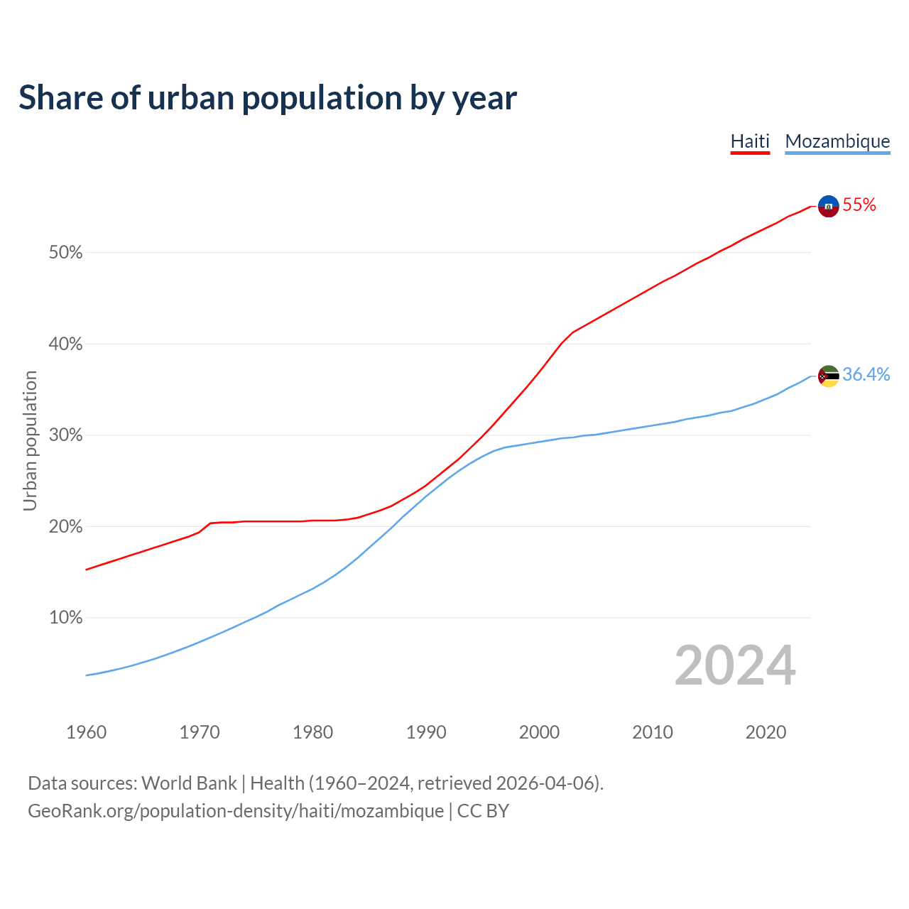 From 2004 to 2024, the share of urban population changed from 41.9% to 55% in Haiti and from 29.9% to 36.4% in Mozambique.