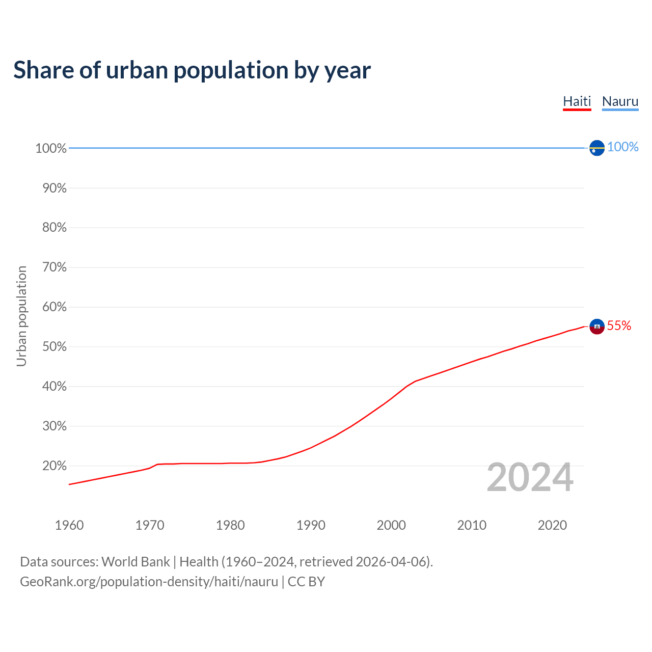 From 2004 to 2024, the share of urban population changed from 41.9% to 55% in Haiti and from 100% to 100% in Nauru.