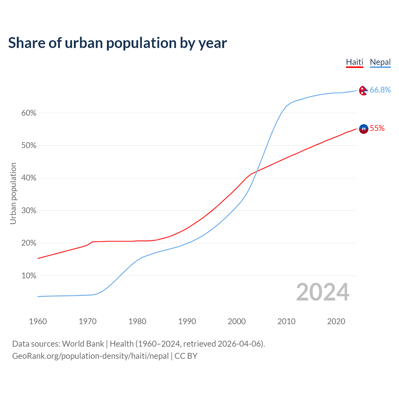 From 2004 to 2024, the share of urban population changed from 41.9% to 55% in Haiti and from 41.6% to 66.8% in Nepal.