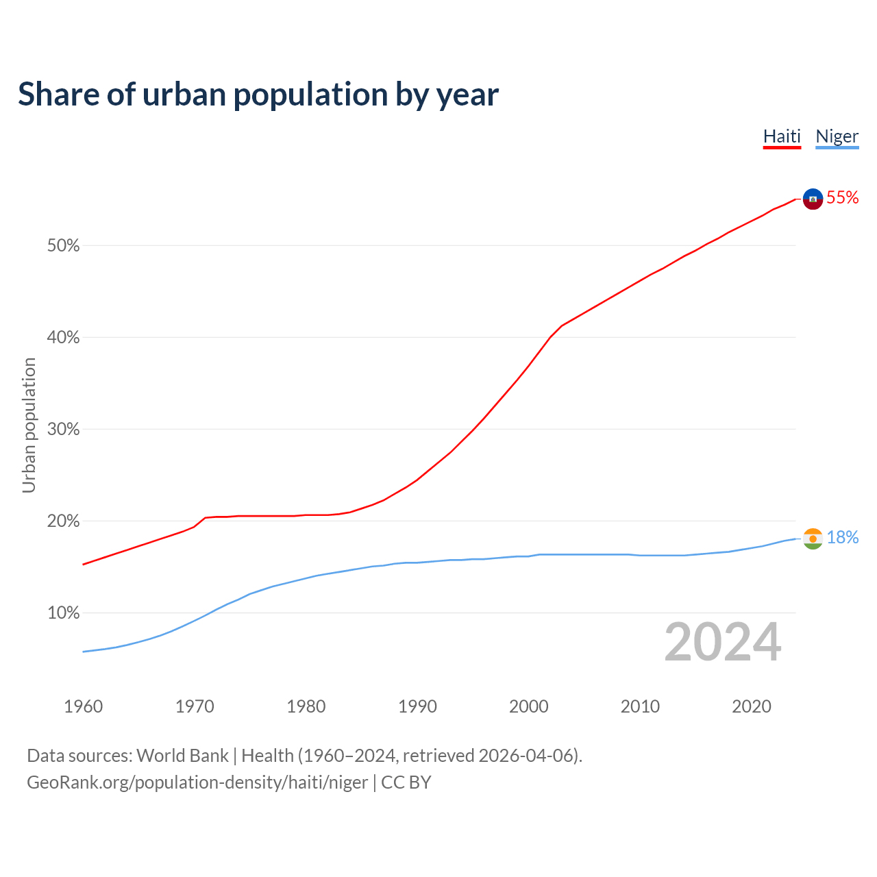 From 2004 to 2024, the share of urban population changed from 41.9% to 55% in Haiti and from 16.3% to 18% in Niger.