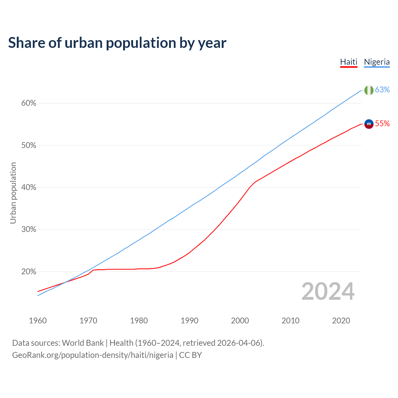 From 2004 to 2024, the share of urban population changed from 41.9% to 55% in Haiti and from 46.7% to 63% in Nigeria.