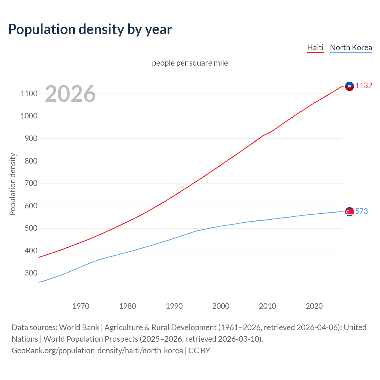From 2006 to 2026, population density in Haiti increased by 30.6%, compared to a 8.64% growth in North Korea.