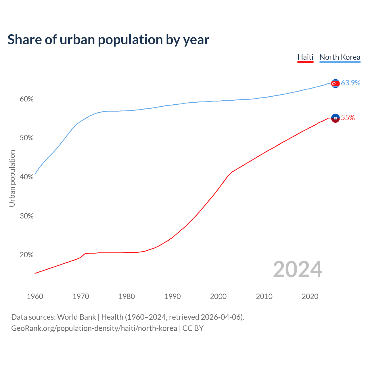 From 2004 to 2024, the share of urban population changed from 41.9% to 55% in Haiti and from 59.7% to 63.9% in North Korea.