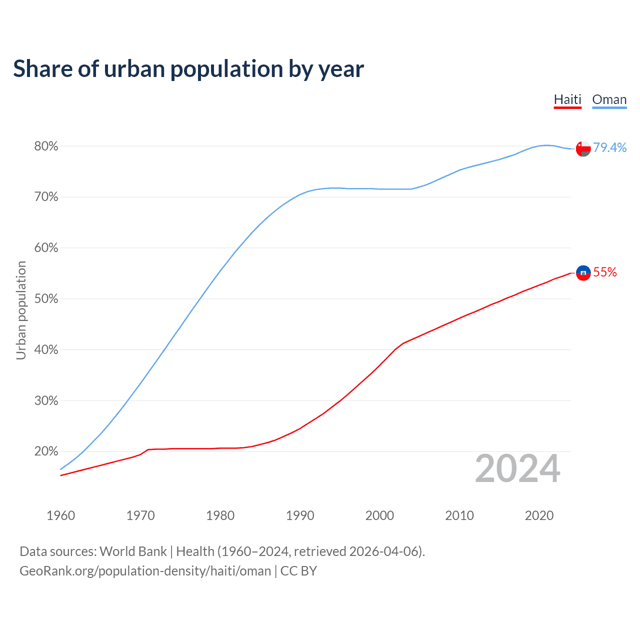 From 2004 to 2024, the share of urban population changed from 41.9% to 55% in Haiti and from 71.5% to 79.4% in Oman.