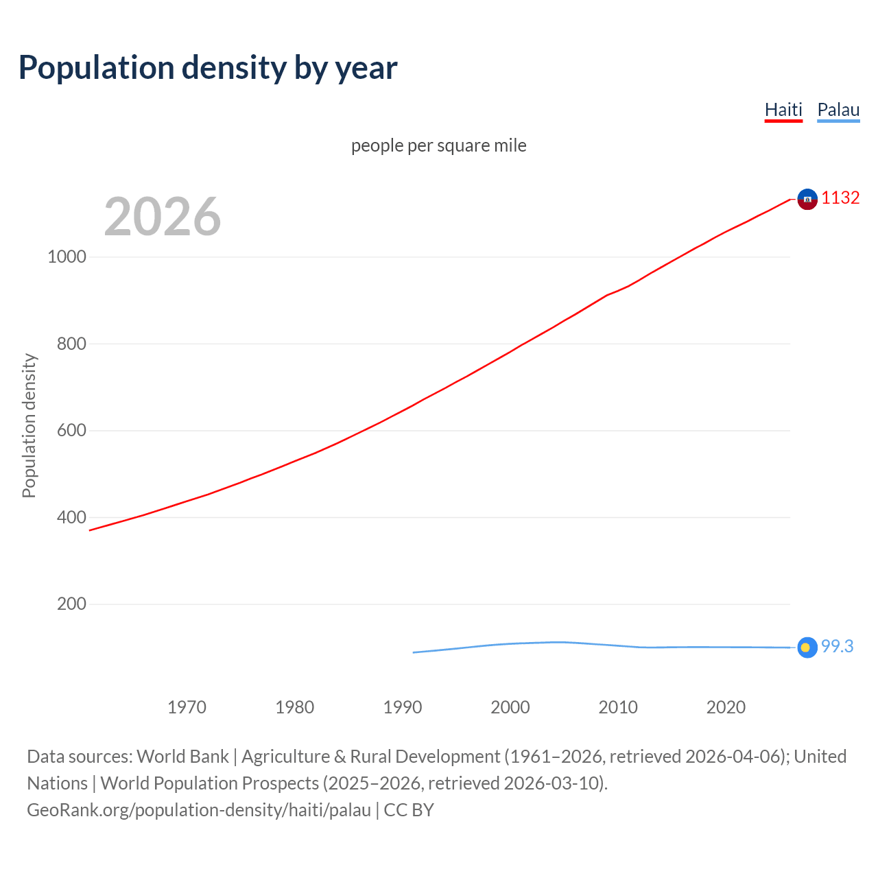 From 2006 to 2026, population density in Haiti increased by 30.6%, compared to a 10% decline in Palau.