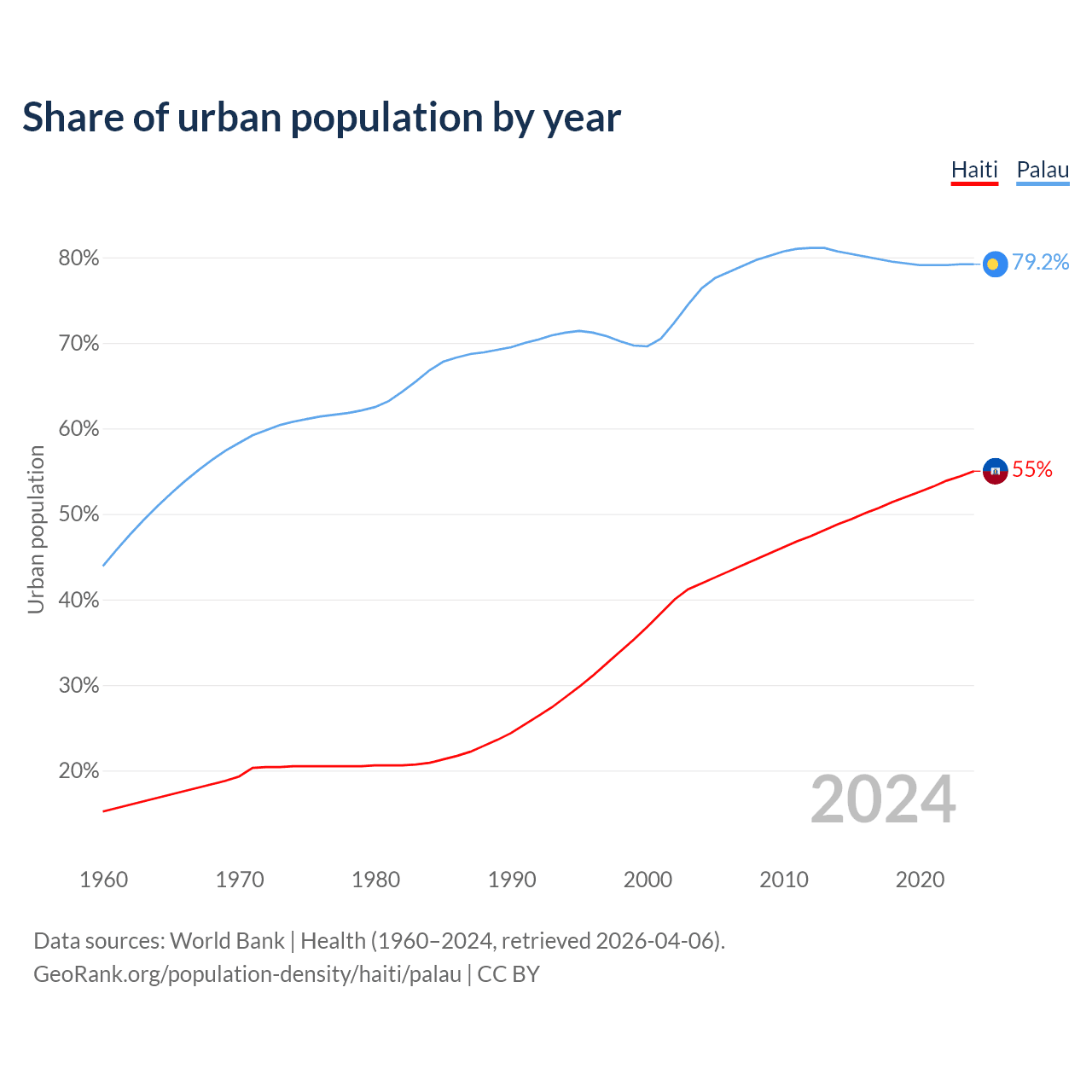 From 2004 to 2024, the share of urban population changed from 41.9% to 55% in Haiti and from 76.4% to 79.2% in Palau.