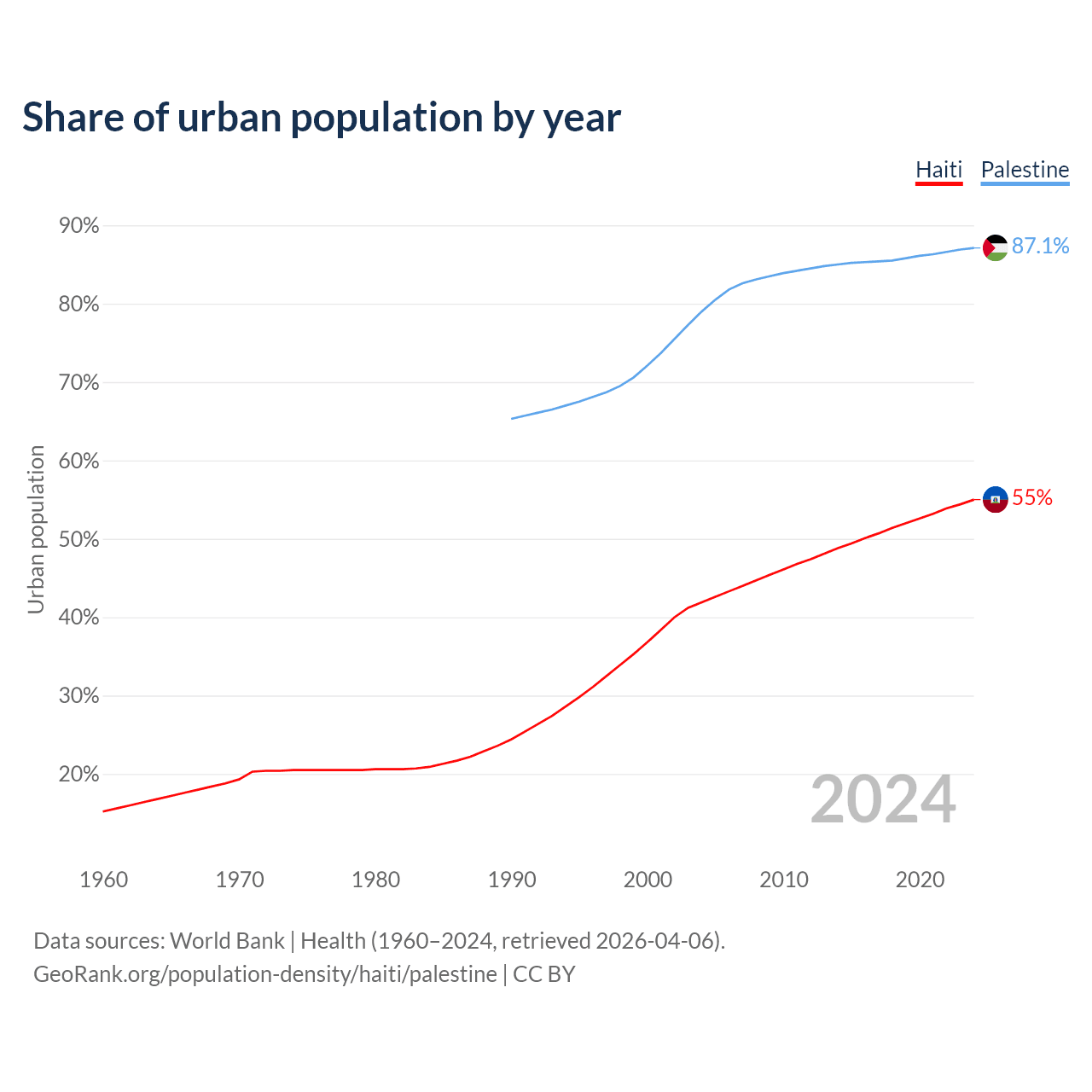 From 2004 to 2024, the share of urban population changed from 41.9% to 55% in Haiti and from 79% to 87.1% in Palestine.