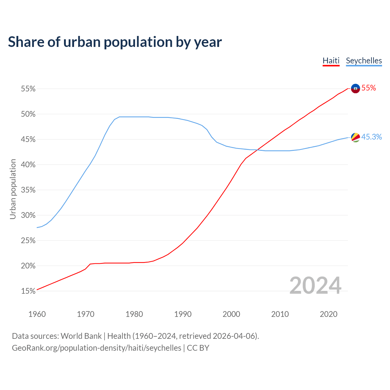 From 2004 to 2024, the share of urban population changed from 41.9% to 55% in Haiti and from 42.9% to 45.3% in the Seychelles.