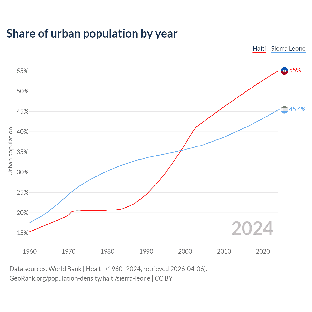 From 2004 to 2024, the share of urban population changed from 41.9% to 55% in Haiti and from 36.5% to 45.4% in Sierra Leone.