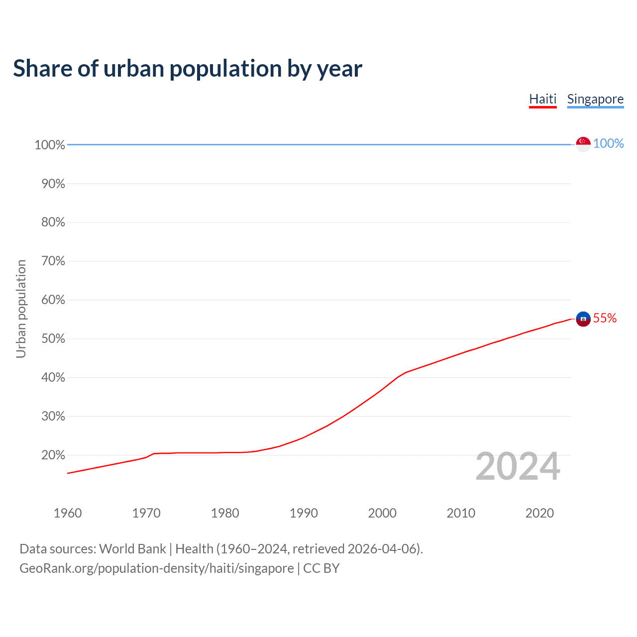 From 2004 to 2024, the share of urban population changed from 41.9% to 55% in Haiti and from 100% to 100% in Singapore.