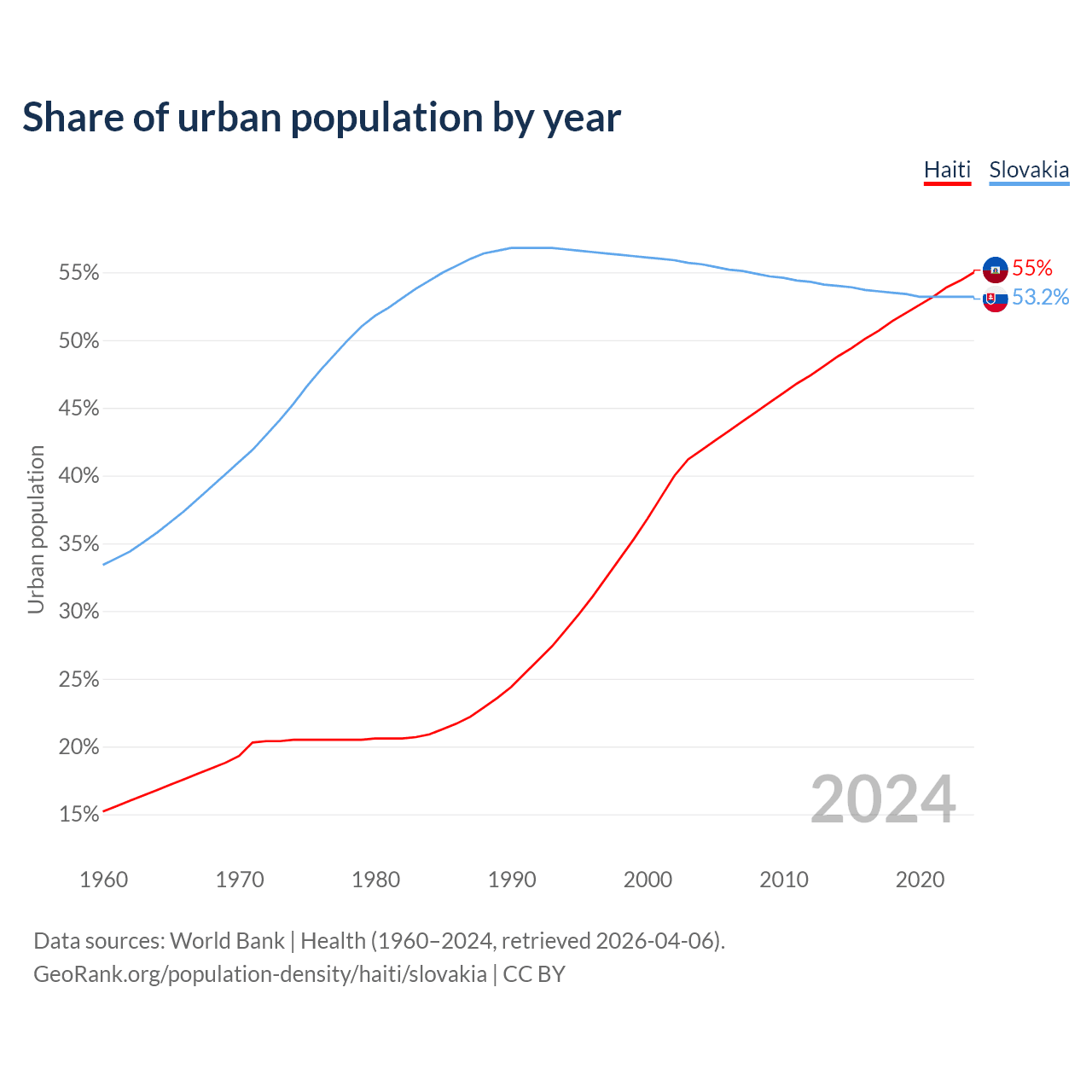 From 2004 to 2024, the share of urban population changed from 41.9% to 55% in Haiti and from 55.6% to 53.2% in Slovakia.