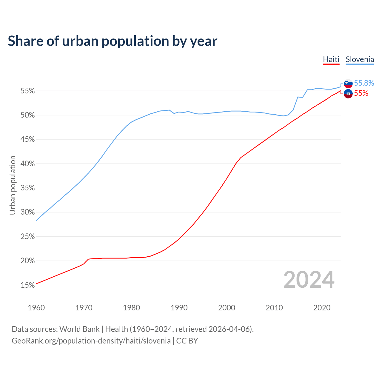 From 2004 to 2024, the share of urban population changed from 41.9% to 55% in Haiti and from 50.7% to 55.8% in Slovenia.