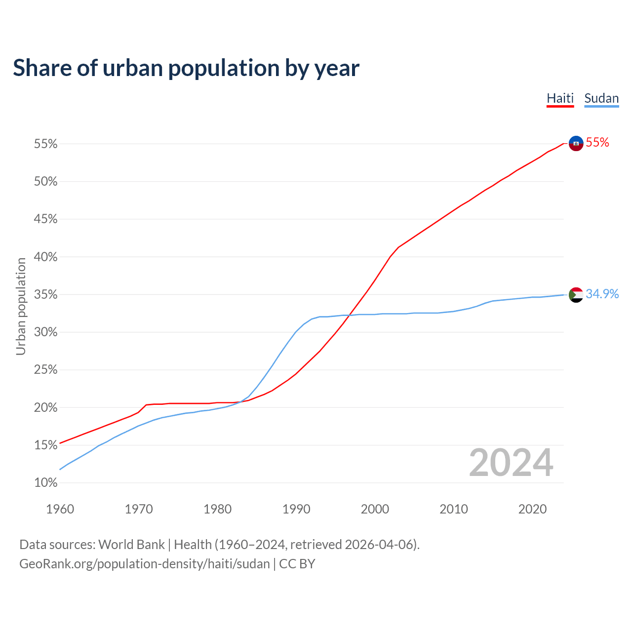 From 2004 to 2024, the share of urban population changed from 41.9% to 55% in Haiti and from 32.4% to 34.9% in Sudan.
