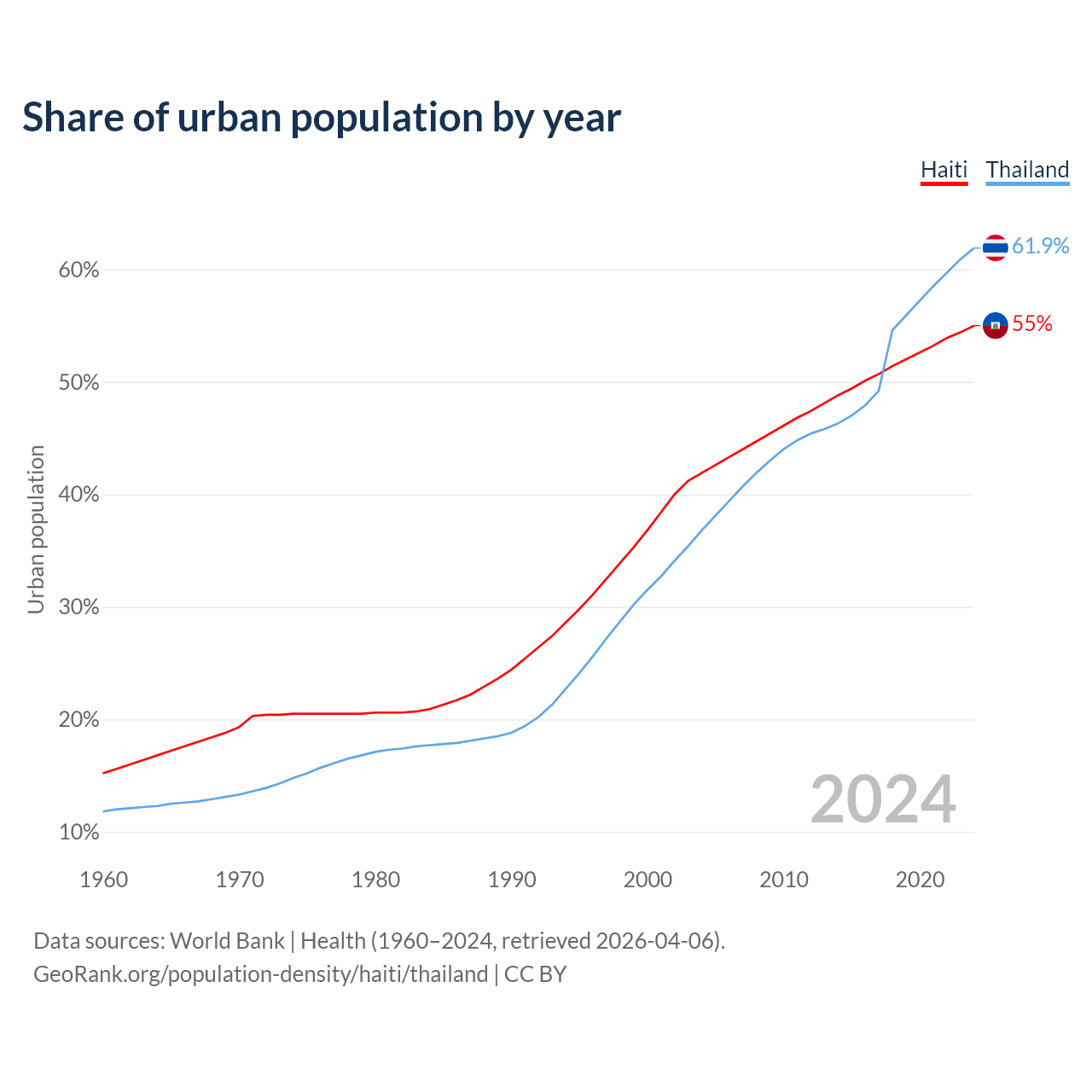From 2004 to 2024, the share of urban population changed from 41.9% to 55% in Haiti and from 36.8% to 61.9% in Thailand.