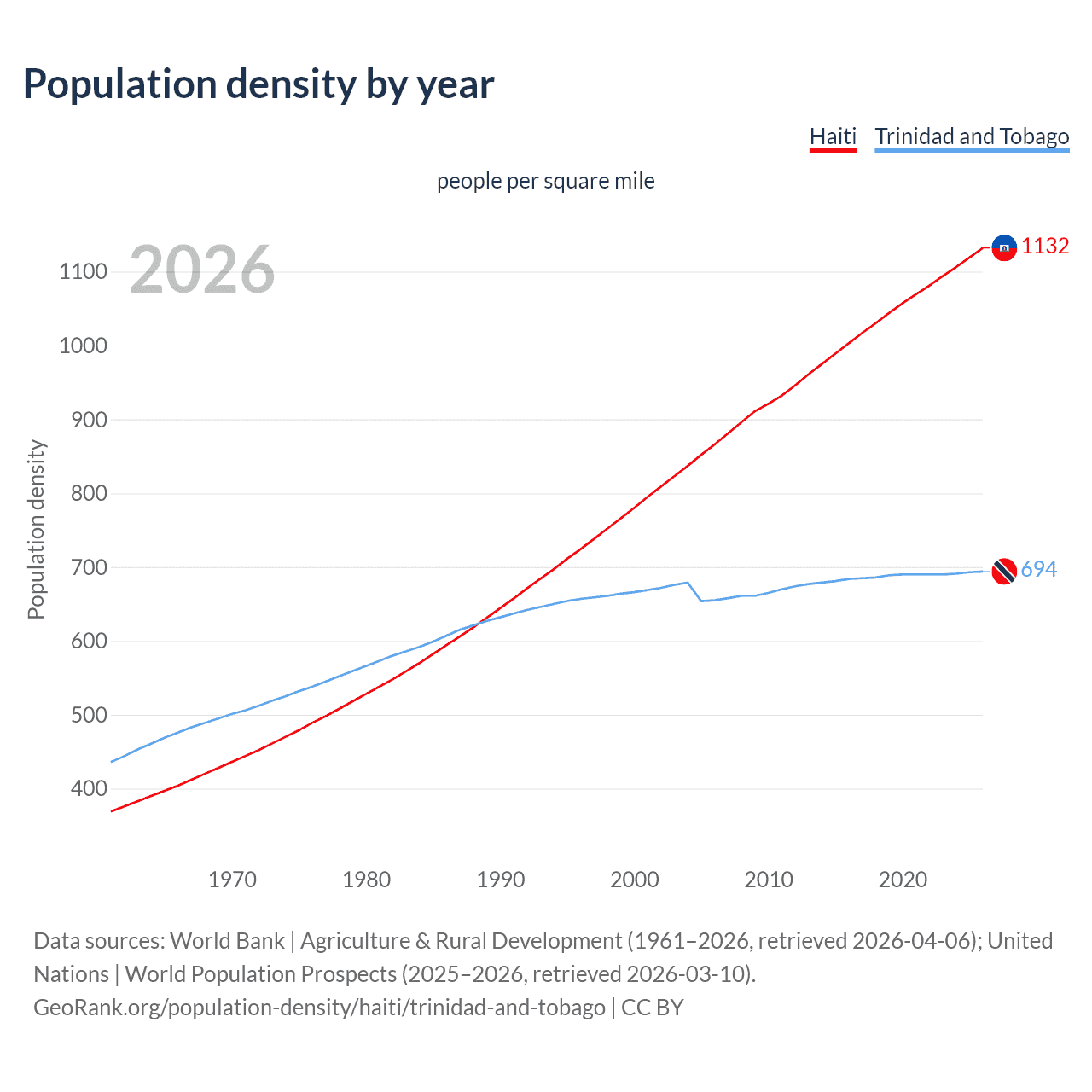 From 2006 to 2026, population density in Haiti increased by 30.6%, compared to a 5.9% growth in Trinidad and Tobago.