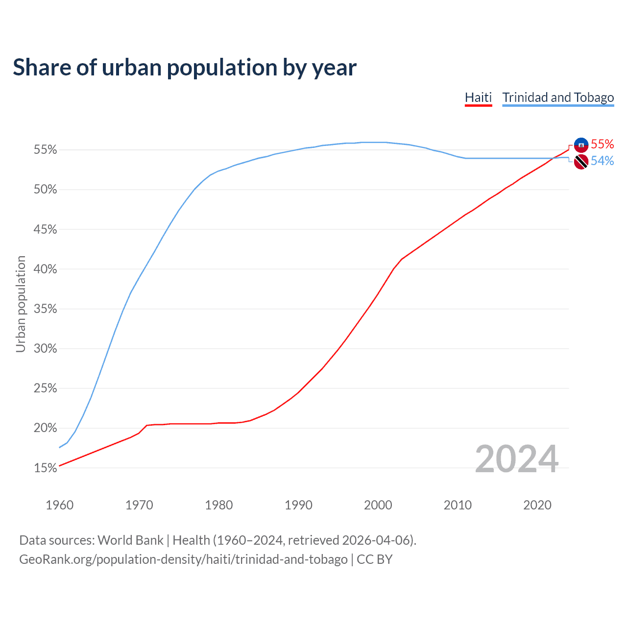 From 2004 to 2024, the share of urban population changed from 41.9% to 55% in Haiti and from 55.6% to 54% in Trinidad and Tobago.