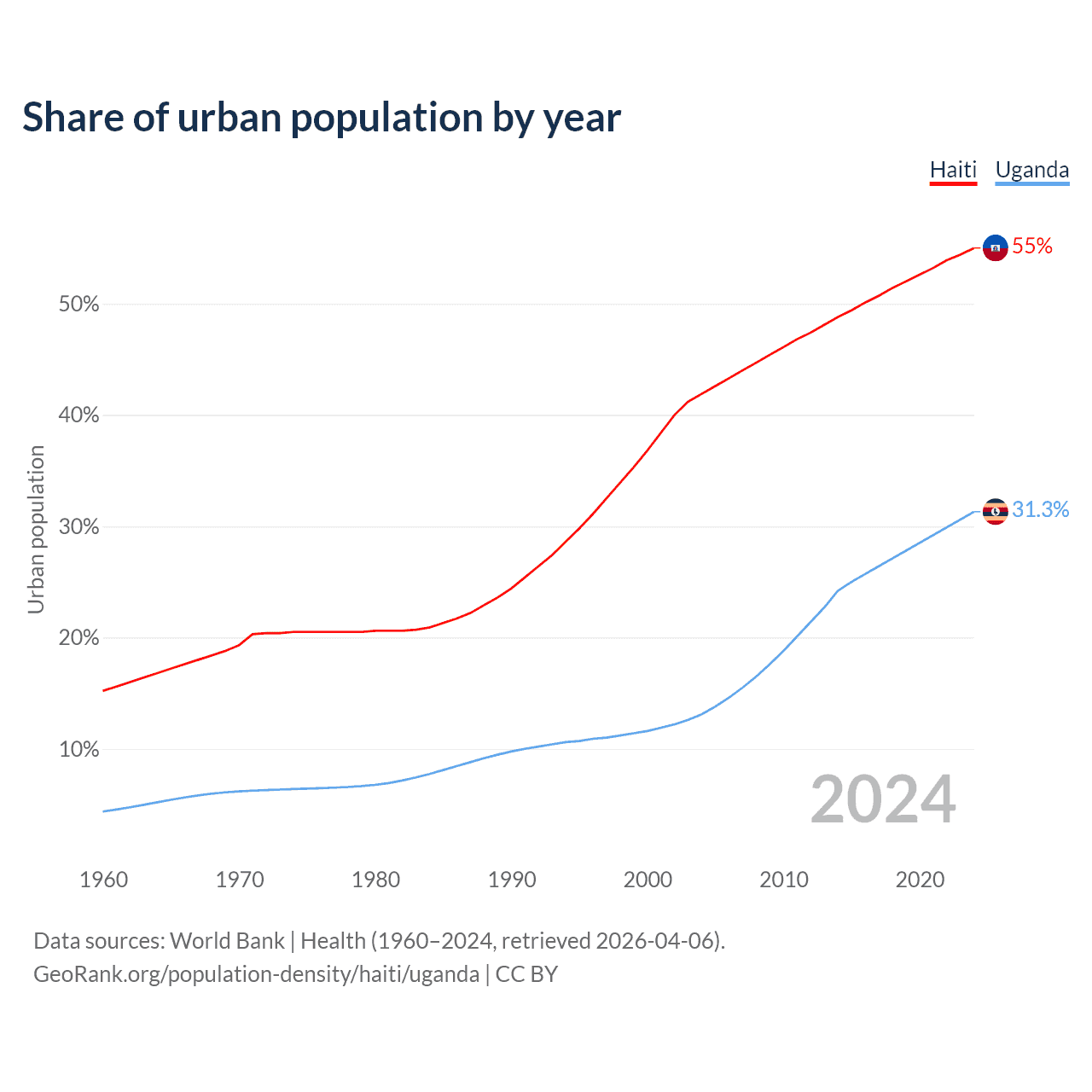 From 2004 to 2024, the share of urban population changed from 41.9% to 55% in Haiti and from 13.1% to 31.3% in Uganda.