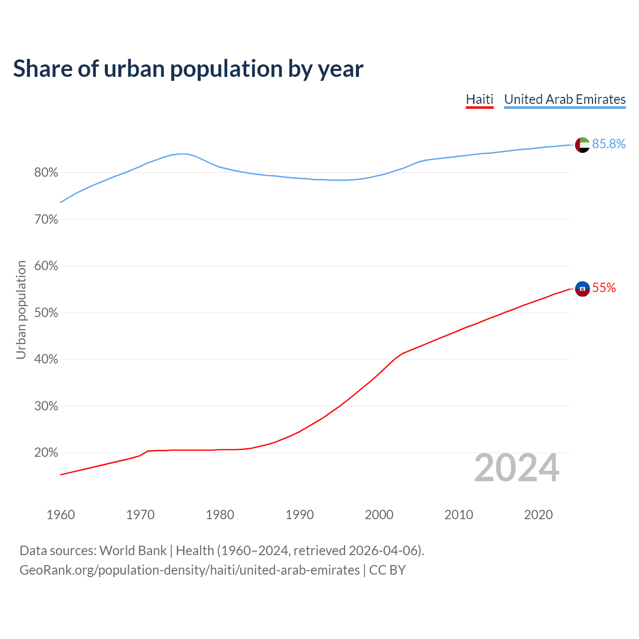 From 2004 to 2024, the share of urban population changed from 41.9% to 55% in Haiti and from 81.5% to 85.8% in the United Arab Emirates.