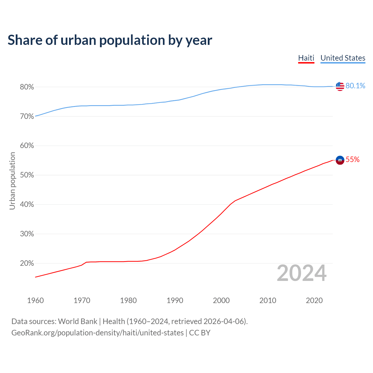 From 2004 to 2024, the share of urban population changed from 41.9% to 55% in Haiti and from 80% to 80.1% in the United States.