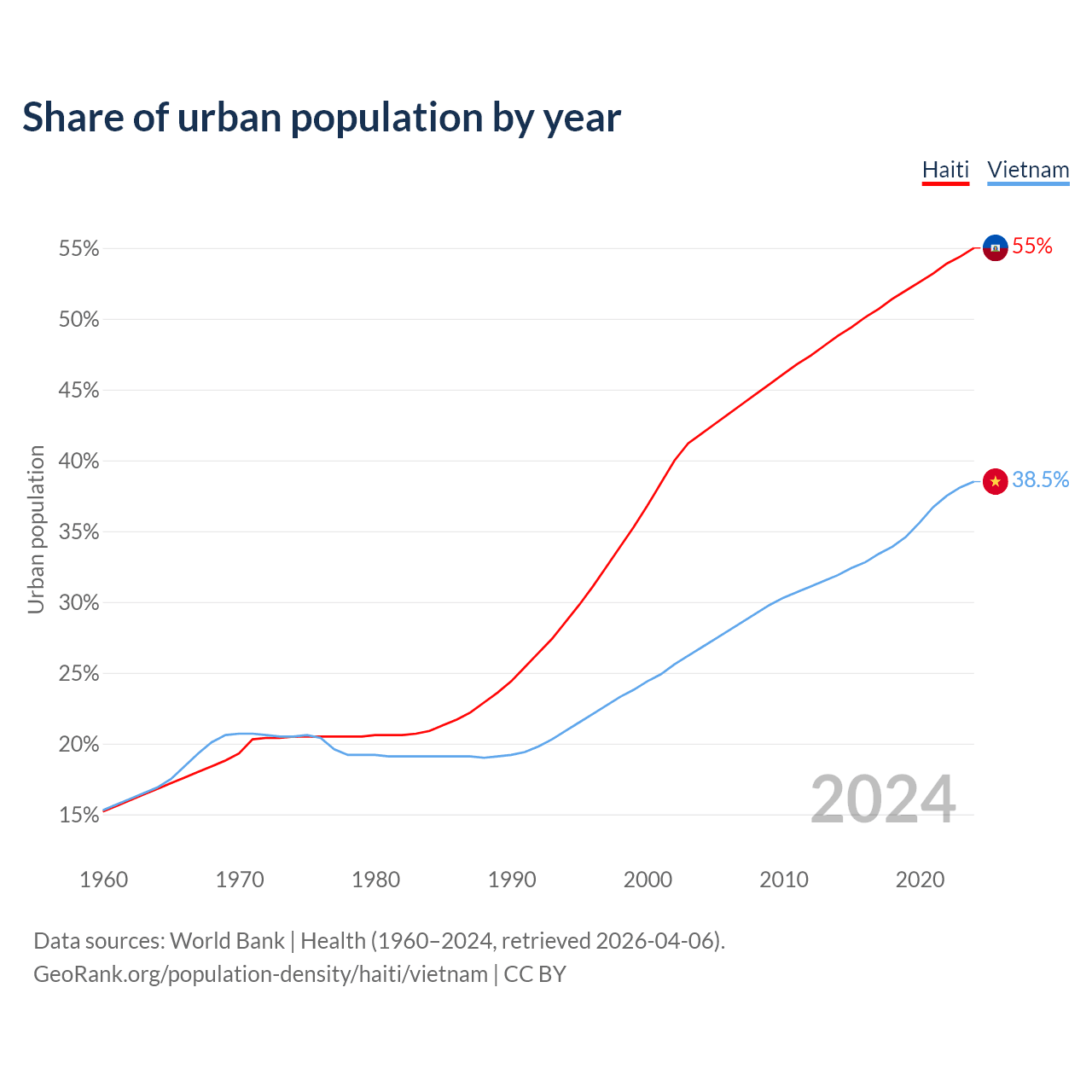 From 2004 to 2024, the share of urban population changed from 41.9% to 55% in Haiti and from 26.8% to 38.5% in Vietnam.