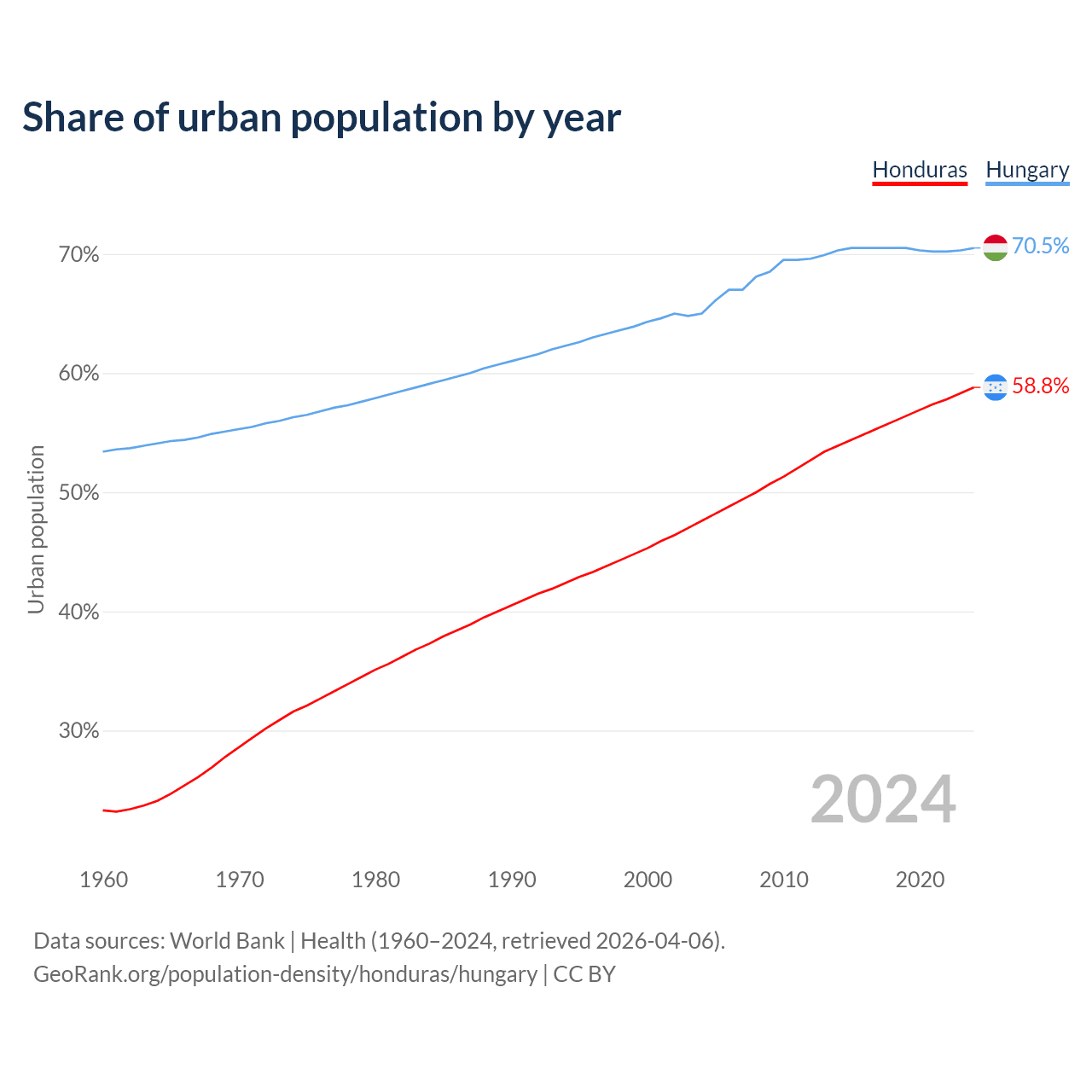 From 2004 to 2024, the share of urban population changed from 47.6% to 58.8% in Honduras and from 65% to 70.5% in Hungary.