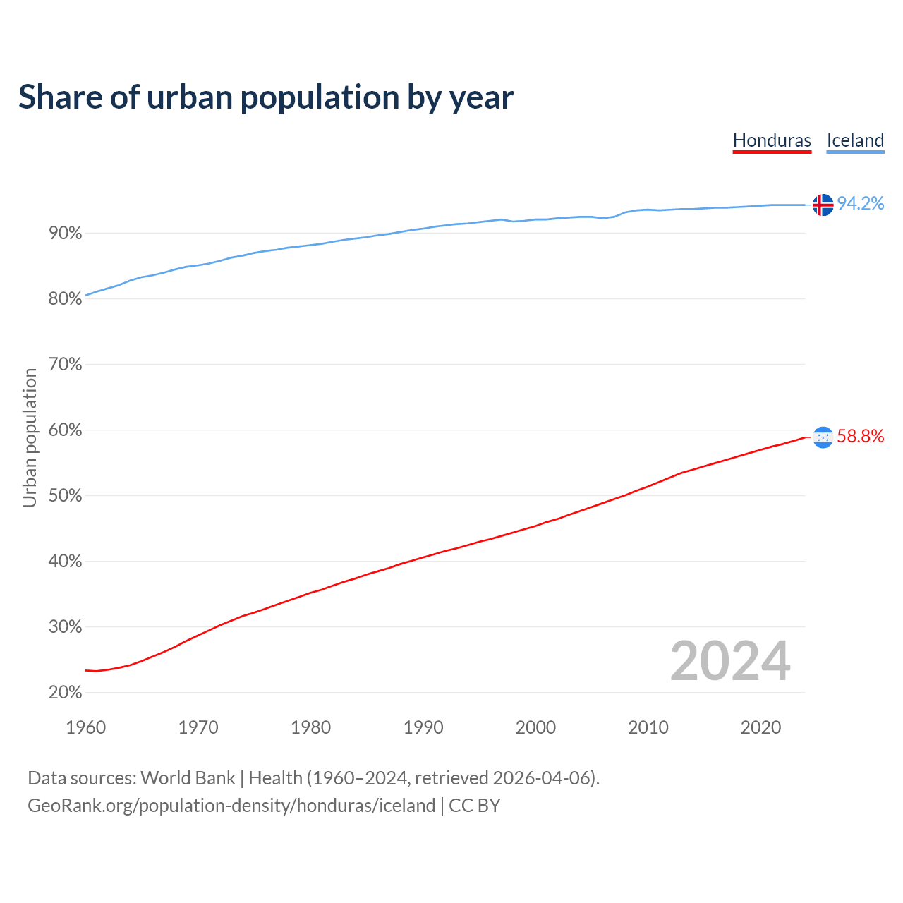 From 2004 to 2024, the share of urban population changed from 47.6% to 58.8% in Honduras and from 92.4% to 94.2% in Iceland.