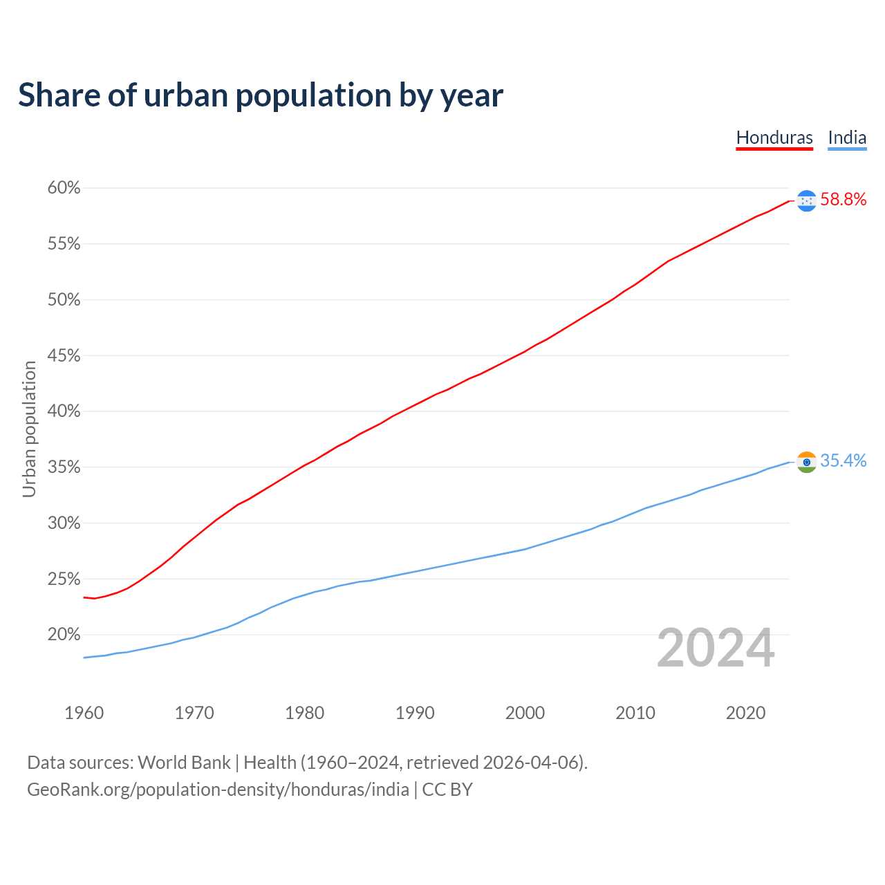 From 2004 to 2024, the share of urban population changed from 47.6% to 58.8% in Honduras and from 28.8% to 35.4% in India.