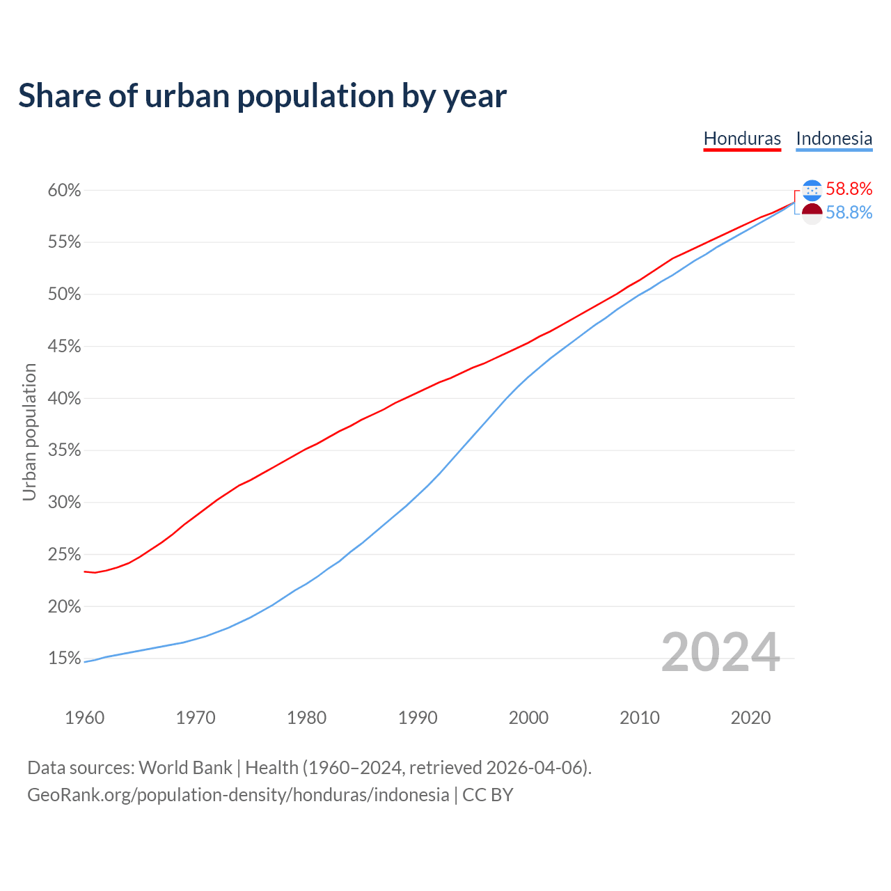 From 2004 to 2024, the share of urban population changed from 47.6% to 58.8% in Honduras and from 45.4% to 58.8% in Indonesia.