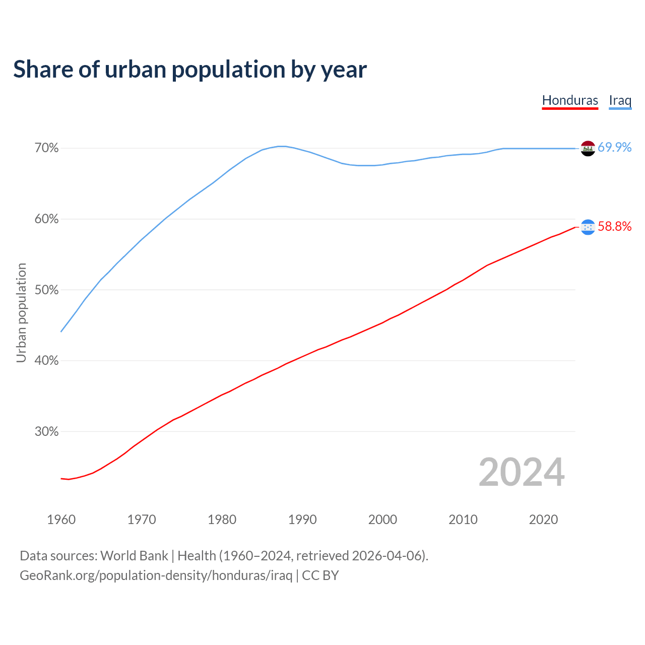 From 2004 to 2024, the share of urban population changed from 47.6% to 58.8% in Honduras and from 68.2% to 69.9% in Iraq.
