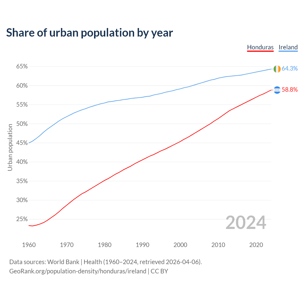 From 2004 to 2024, the share of urban population changed from 47.6% to 58.8% in Honduras and from 60.2% to 64.3% in Ireland.