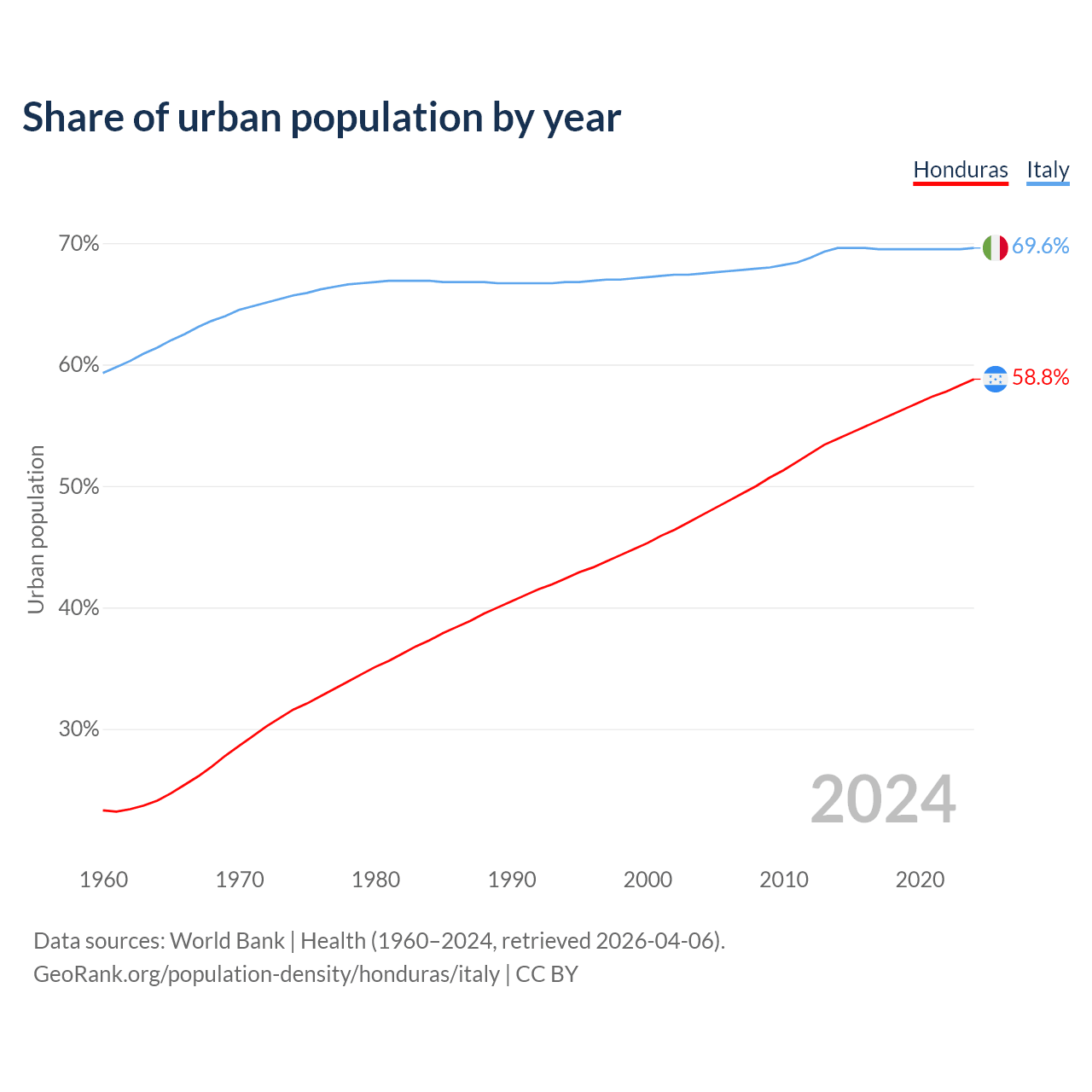 From 2004 to 2024, the share of urban population changed from 47.6% to 58.8% in Honduras and from 67.5% to 69.6% in Italy.