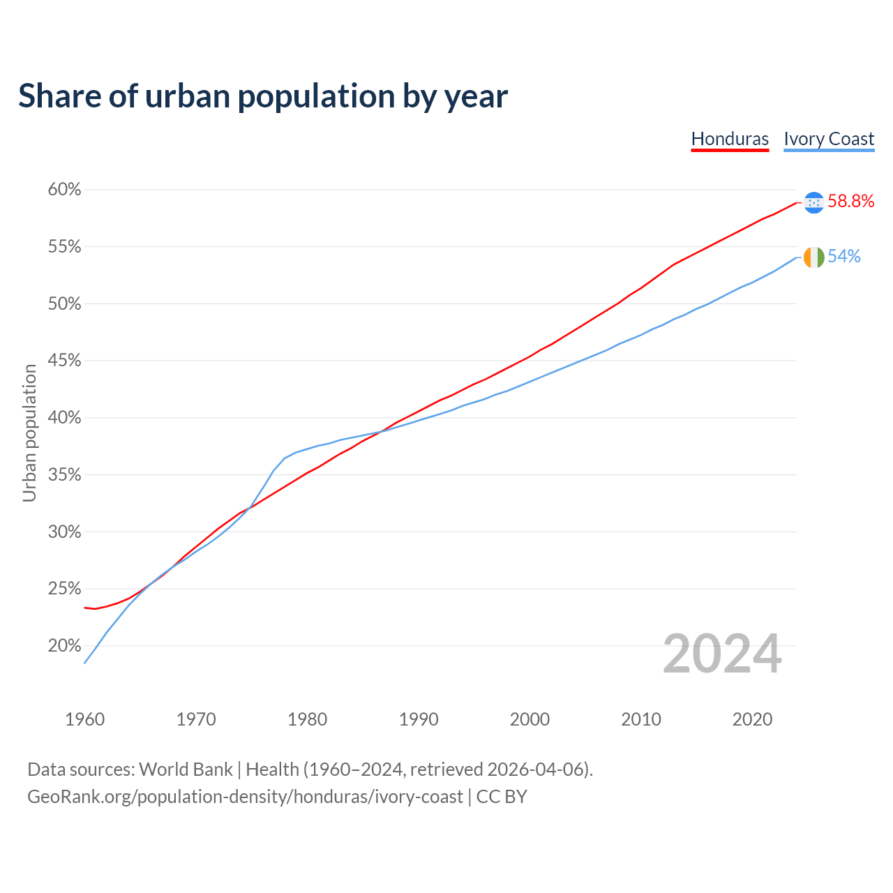 From 2004 to 2024, the share of urban population changed from 47.6% to 58.8% in Honduras and from 44.7% to 54% in Ivory Coast.