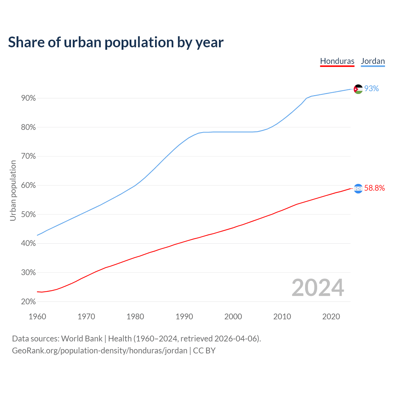 From 2004 to 2024, the share of urban population changed from 47.6% to 58.8% in Honduras and from 78.3% to 93% in Jordan.