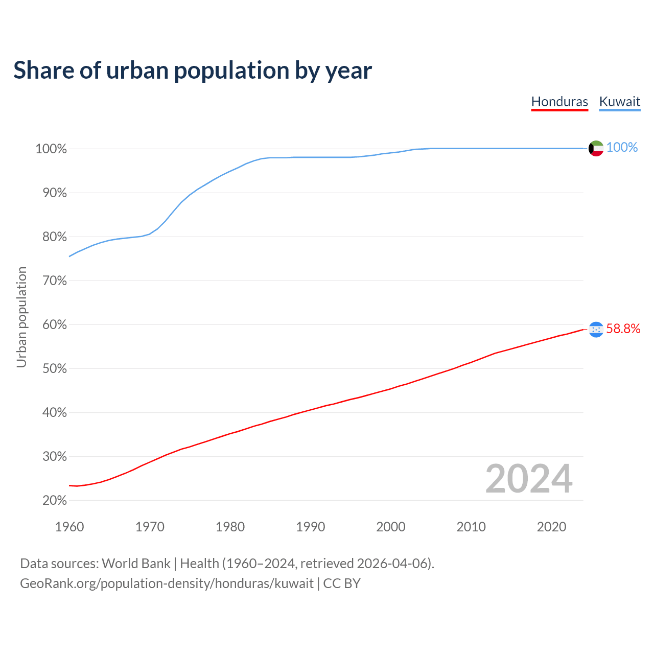 From 2004 to 2024, the share of urban population changed from 47.6% to 58.8% in Honduras and from 99.9% to 100% in Kuwait.